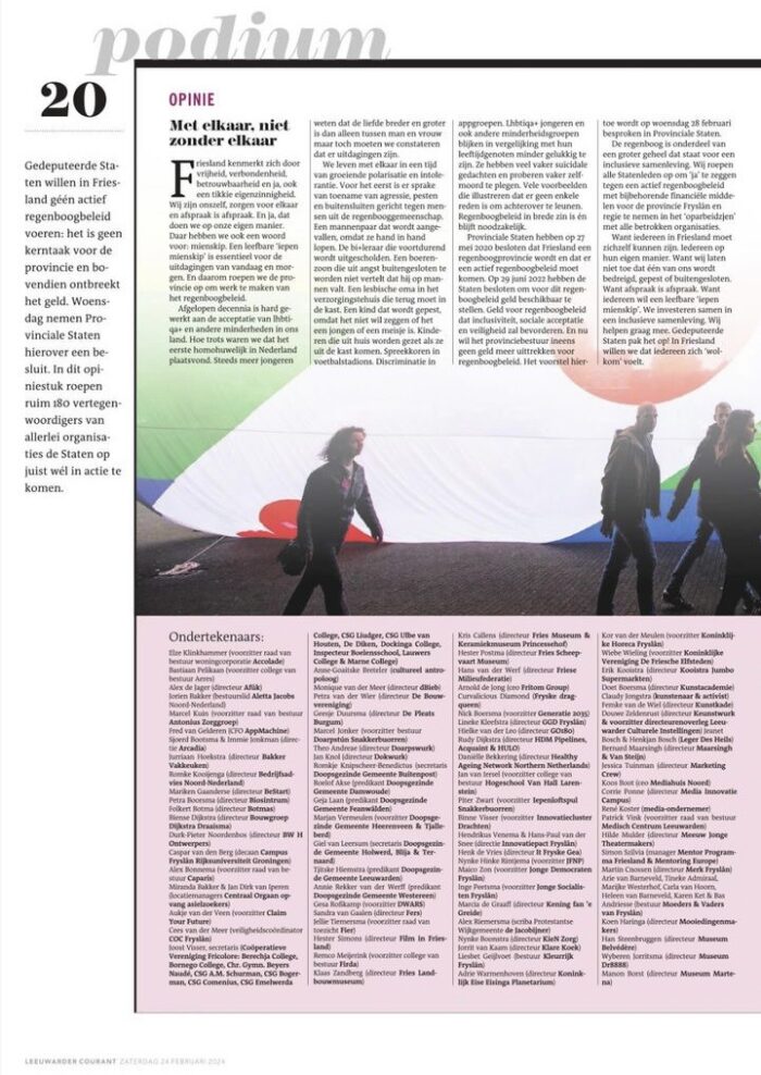 180 (HONDERDTACHTIG) vertegenwoordigers van allerlei organisaties roepen dit weekend de Staten op om wel in actie te komen. Het stuk staat in de Leeuwarder Courant (achter hun betonnen betaalmuur, want waarom zou je een opiniestuk, dat je niet zelf hebt geschreven, en dat van maatschappelijk belang is, publiekelijk leesbaar op je site zetten). Het is een vriendelijk artikel, waar in duidelijk woorden wordt uiteengezet waarom er een actief Regenboogbeleid moet komen. Ze geven veel voorbeelden waarom het moet, en het sluit aan op wat de insprekers twee weken geleden hebben gezegd.